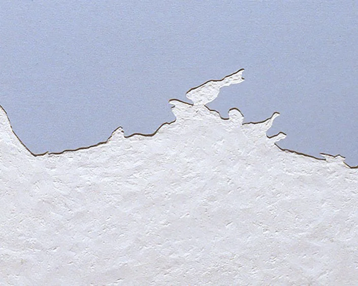 To achieve the precise detail of these works, Kim traces the numerous coastlines and borders from a map and then traces those outlines onto panels of painted sheetrock. She transfers each intricate detail and then meticulously carves her relief directly into the sheetrock. The subtle blues, grays and greens in the panels suggest water and therefore we instinctually read these as coastlines. Installed on the gallery wall, these images oscillate between positive and negative space, increasing the ambiguity of place andscale. Taken completely out of context, Kim gives us the opportunity to thinkdifferently about the borders that divide and define all the nations of the world.