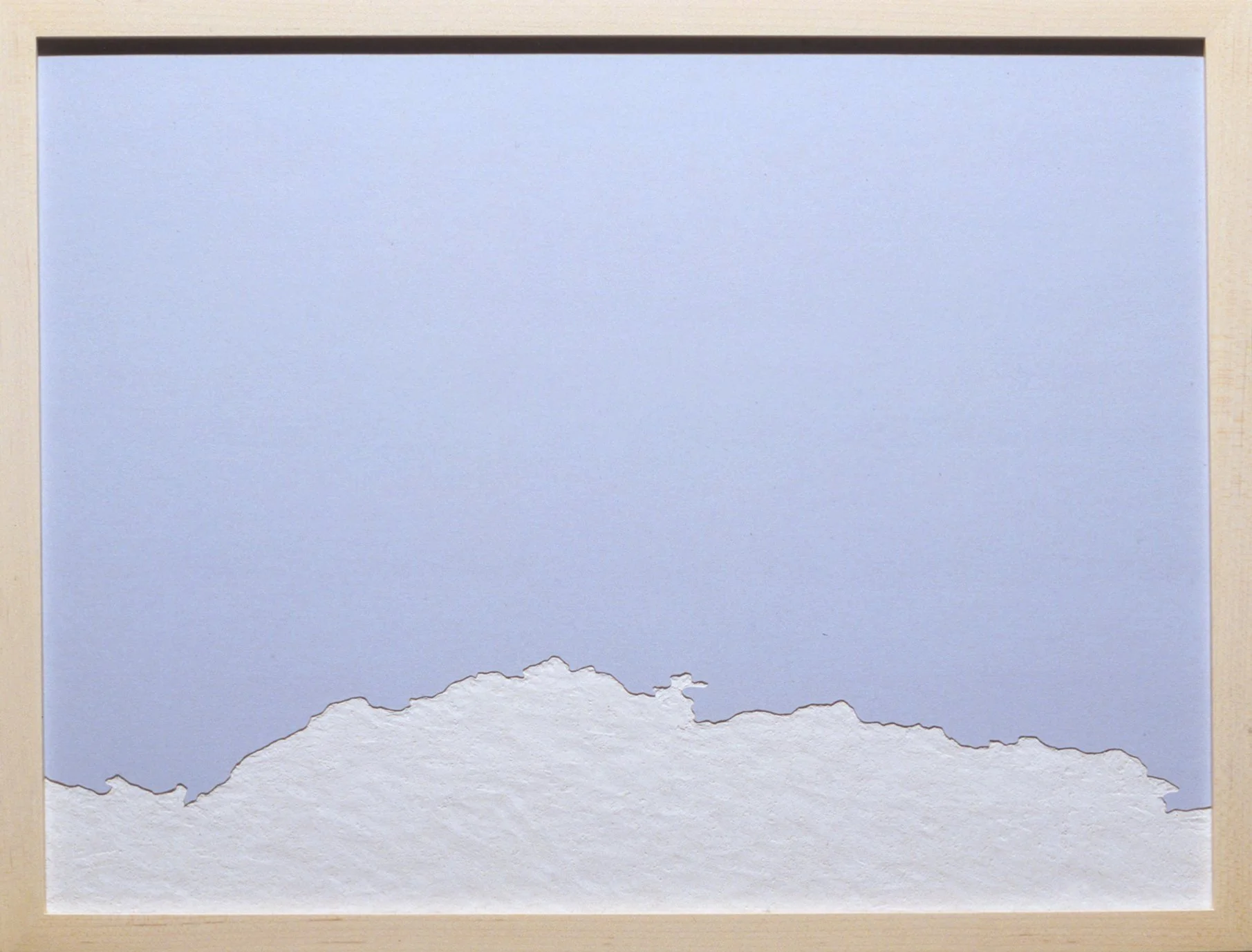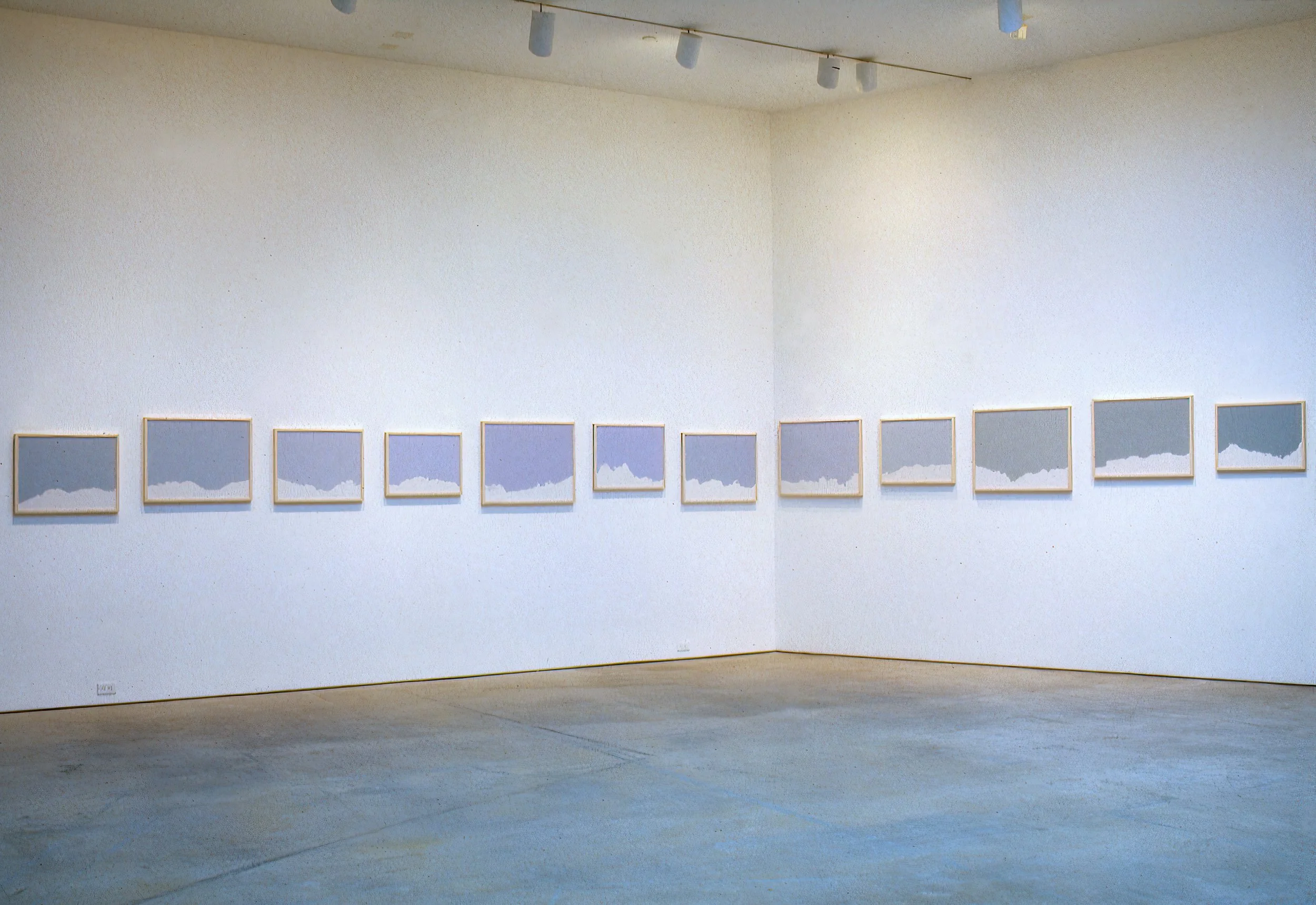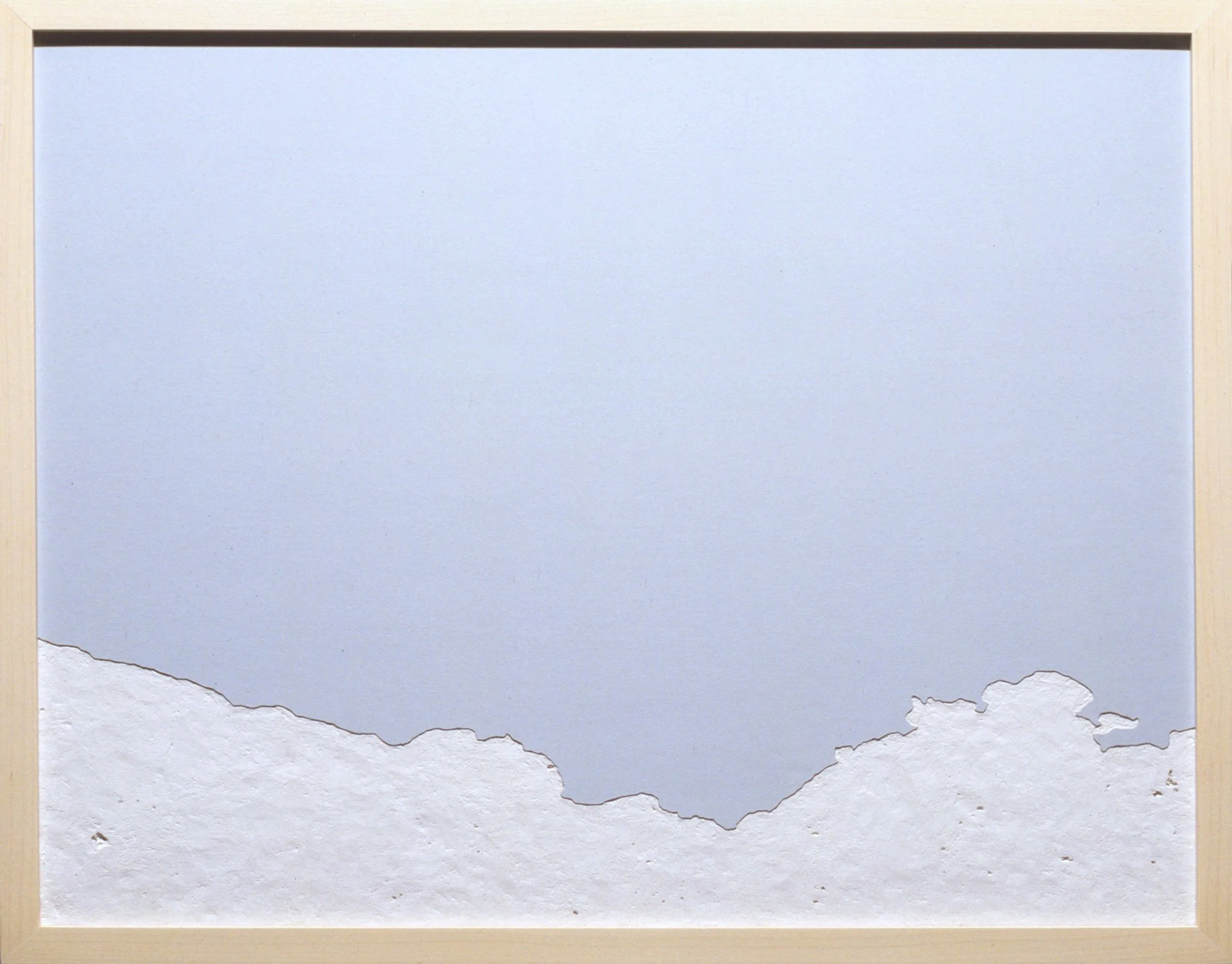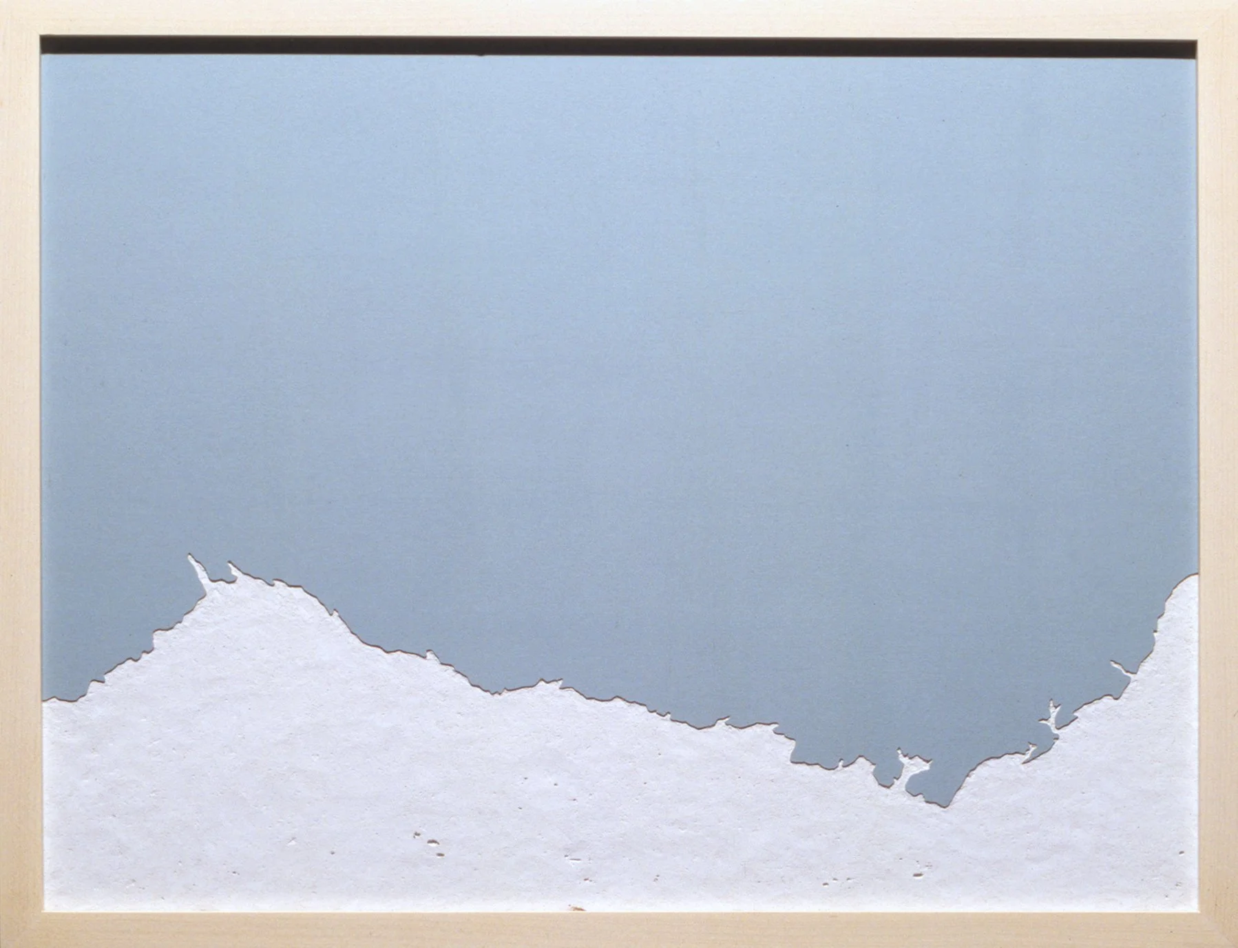 “YOUNG KIM is also interested in how we process information and see natural topographies from various vantage points. She explores both physical topography and abstract patterns of maps in her photographs, floor-based sculptural installations and paintings. Untitled (Line), 2000, twelve panels of hypothetical landscapes inspired by real maps, can be read either as horizons of land and sky or as aerial views of coastlines. The minimal, bifurcated panels are both paintings and sculptural reliefs: the sky/sea is painted in blue-hued tones, while the landmass is carved directly from sheetrock. The scale is also ambiguous-one cannot determine the size or expanse of the given landscape. While Kim first used maps as a signifier of her geographic relocation to California from Korea, this work raises the issue of variable readings of a given topography.” -Karen Moss